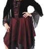 Rule over the other vampires at the Halloween party this year in our Plus Size Queen of the Vampires Costume. This elaborately-designed costume comes in hunter green satin with an overskirt and a bat hair clip. The main vampire body of the dress has been broken up into two parts on either side of the black belt. The lower half runs to the floor and comes with a sheer green overskirt to give you a light and airy look. The upper portion has a ruffled green satin chest with gold trim that matches the gold bat on the belt’s buckle. The vampirish queen-like sleeves are flared out for an airy shoulder area while the sheer fabric from the overskirt is cut into a loose drape that falls off the lower part of your arms. The black stand-up collar comes as part of the choker you’ll be wearing, and the black bat hairclip really send this one over the top.