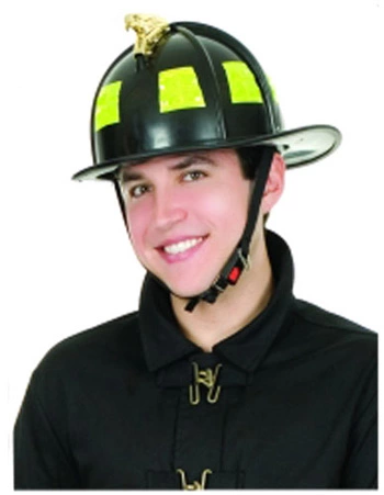 Deluxe Fireman HelmetComplement your firefighter costume with this fireman helmet! The black helmet is made from durable plastic and features green reflection tape for an authentic look. A gold eagle is attached at the top and a black vine pattern lines the hat’s bill. It has a circumference of 23 1/2″ and features a removable size adjuster that measures a circumference as small as 20 1/2″ making this helmet great for adults and kids. There is padding on the inside for a comfortable fit as well as an adjustable chin strap to secure the helmet.