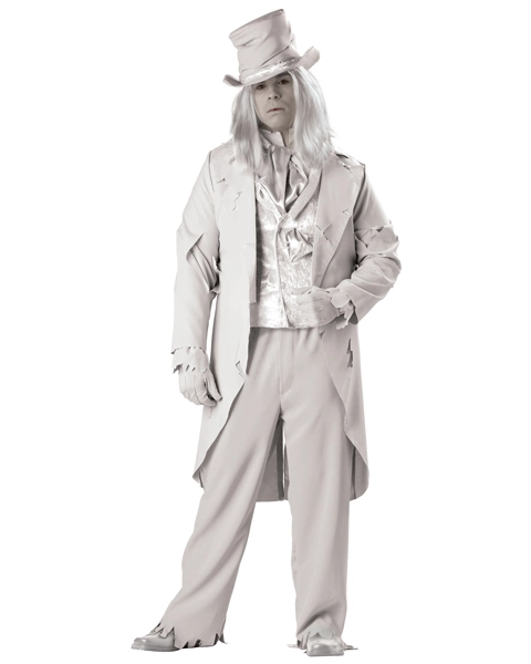 Coat, vest with attached shirt sleeves, pants, dickie with scarf collar, hat gloves and wig.