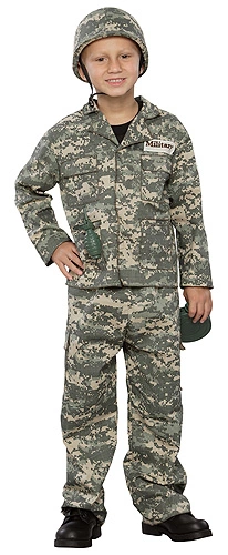 HelmetTopPantsToy GrenadeToy CanteenRally the troops this Halloween in this child army soldier costume! This 100% cotton costume features a camouflage print. The jacket has velcro in the front for closure and the pants have a comfortable elastic waistband. The jacket is decorated with a military patch for a realistic look. The matching helmet has a 24″ circumference. Also included is a green plastic canteen and toy grenade. Support the troops in this great child costume.