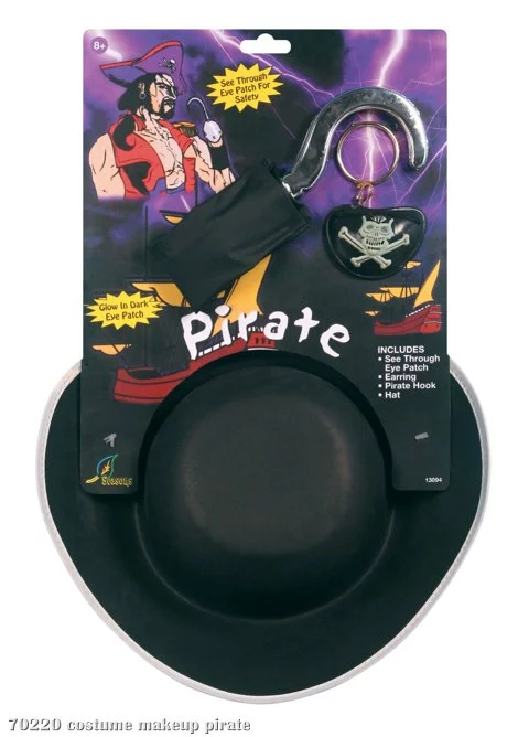 Change from a Regular Guy to a Rogue Pirate in no time with these Pirate accessories! The Pirate Accessory Kit (Adult) includes a classic black Pirate hat, a silver metallic hook, a see-through black eye patch with a skull and crossbones, and one golden hoop earring.