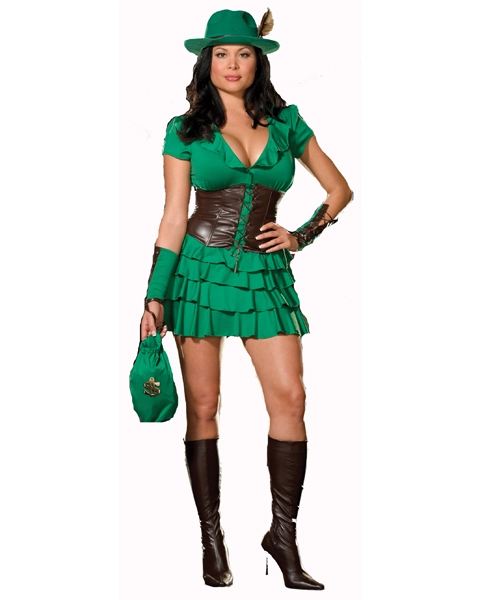 Ladies, now you can get in touch with your inner heroine, even as you strut your sexy stuff! You can steal hearts from the men or gold from the rich in this sexy plus size Robyn da Hood Costume. This sexy outlaw costume recalls the classic legend of Robin Hood and includes a six piece set–green ruffle hem dress and faux leather waist corset, hat, lace-up gauntlets and draw string bag. Whether you’re getting ready for an adult costume party, a Halloween party, the Renaissance faire or a live action roleplay event, you’ll look great! You’ll be able to strut your stuff and get plenty of attention! The boots aren’t included, so check out our sexy women’s pirate black side lace up boots so that you can make this costume work for you! The Robyn Da Hood plus size adult costume is on the run, so make sure you get yours today!