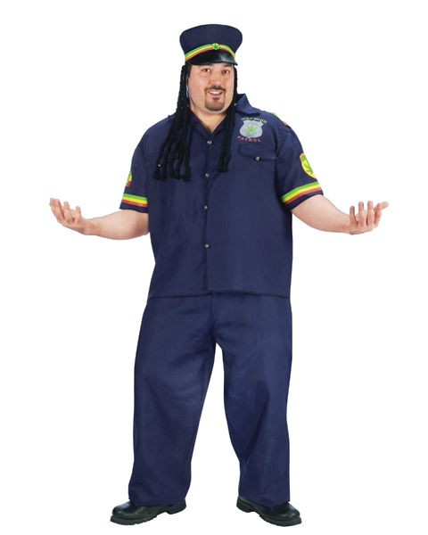 Have a great time being the whacky long arm of the law when you wear this Plus Size Way High Patrolman Costume. The only people who need to worry about shaken down by this patrolmen are the guys with Ganja. This whimsical cop outfit for men consists of a blue short-sleeved button down police shirt with Jamaican flag colors on the cuffs and a badge with laughing marijuana logos. Matching blue pants and an officer’s hat trimmed with Jamaican flag colors and a weed insignia. Your next costume party or Halloween night gala will be alarmed then amused when you swoop in to bust all of the guests. You can accessorize this humorous police outfit with an official looking Police Whistle. A Plastic Billy Club will come in handy if you have to keep any patrons in line at your next party, and Metal Handcuffs top off a unique costume.