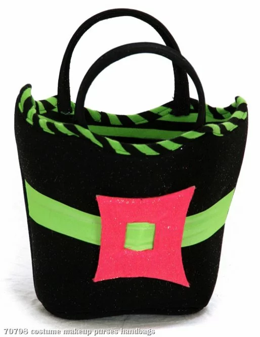 A Cute Bag to complete the Spiderina Child Costume,make sure your Little Spiderina has somewhere to store her spiders! It features a black handle, black and green striped trim, a black background, and a green band with a pink square in the center.