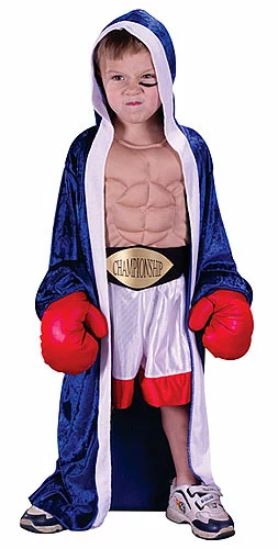 Boxer Shorts w/attached Muscle ChestBeltGlovesRobeGet your lil’ champ ready for the ring in this toddler boxer costume! The adorable costume includes a polyester jumpsuit that velcros in the back for closure. It consists of a flesh-colored chest that has padding for muscular definition as well as white shorts with black and red trim. A blue, polyester robe is worn over the jumpsuit and has the appearance of crushed velvet. The robe has a hood and is trimmed in white. The costume also includes a black belt with a gold “championship” buckle that ties around the waist and red boxing gloves. The gloves are filled with padding for a realistic look and have elastic lined in the wrist for a secure fit. Perfect for your little tough guy!